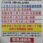 2025.12.25 お知らせ たかはししのえ 年末年始のお知らせ 「年末年始のお知らせ」 年末年始の営業については、下記の通りになりなす。 12月30日(火)年内最終通常営業 9時~18時 12月31日(水)年末休業 令和8年1月1日(木)元日休業 1月2日(金)休業 1月3日(土)休業 1月4日(日)9時~17時 初売り営業開始 ※発熱・体調不良の方は、当番医までお問い合わせください。 大変ご迷惑をおかけいたしますが、よろしくおねがいいたします。